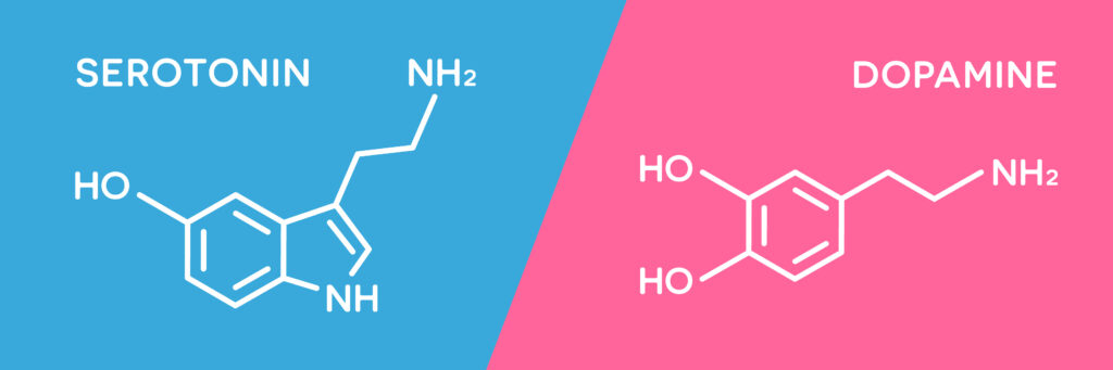 Vector illustration flat design of serotonin and dopamine hormone symbols. Human body hormones molecular chemical formula.