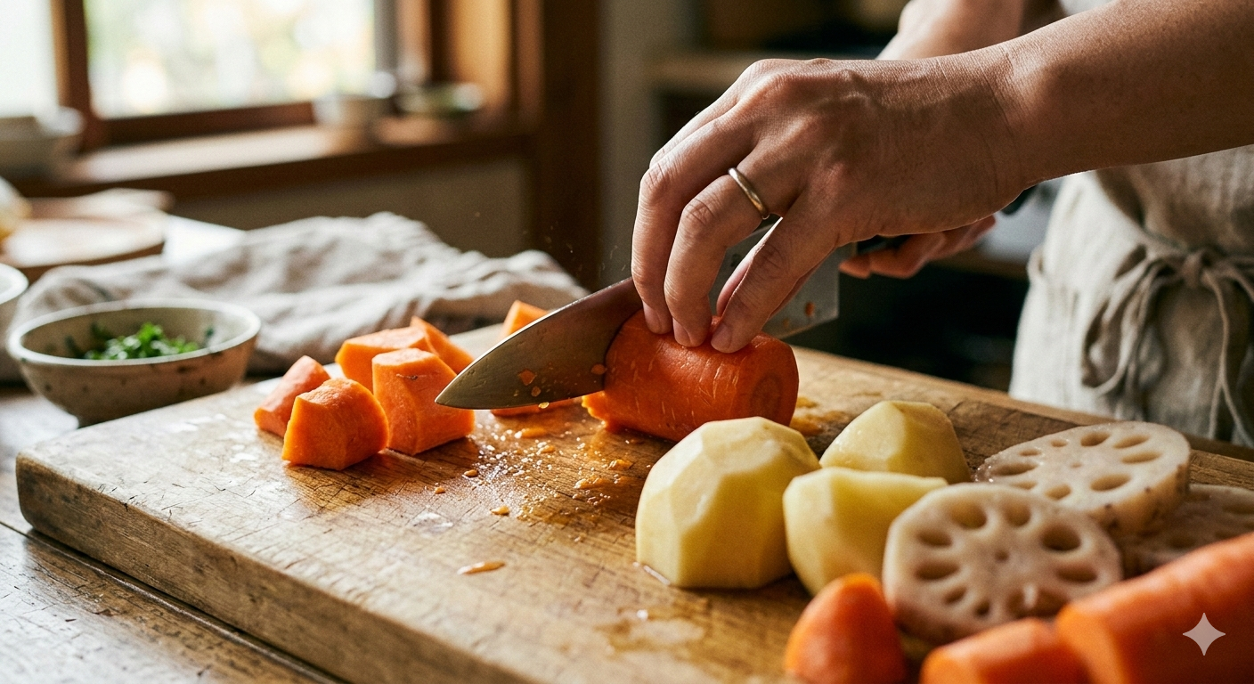 カレーやシチュー: 野菜を小さく切らず、ゴロゴロとしたサイズにする。